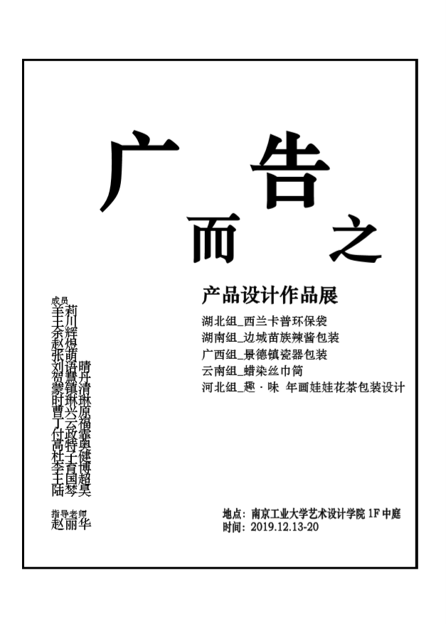 12 月 13 日-20 日,在文科楼1F中庭,太阳集团tcy8722产品设计系举行“广而告之”产品设计展,这是由产品设计系赵丽华老师组织策划的。产品设计2016级员工在广告设计课程学习中分成五组,围绕西兰卡普、苗族辣酱、景德镇瓷器、蜡染丝巾以及年画茶包等进行广告设计。展出作品包括:海报、作品实物、场景设计、文创礼物(明信片、书签、贴纸等)、宣传单、投票箱。