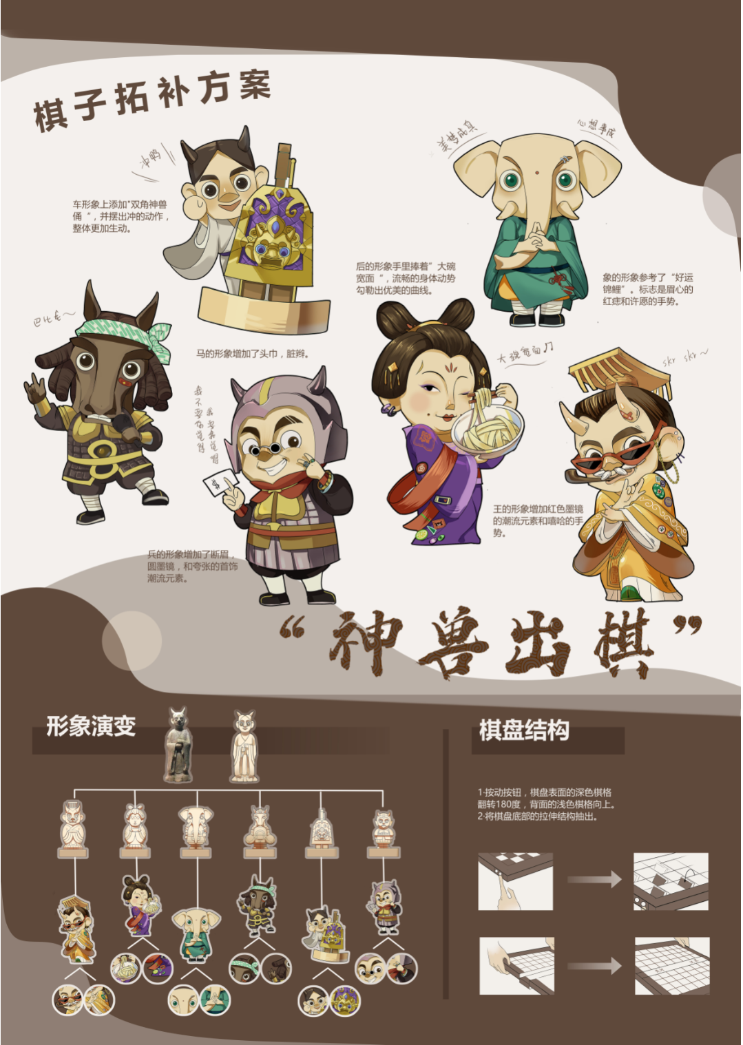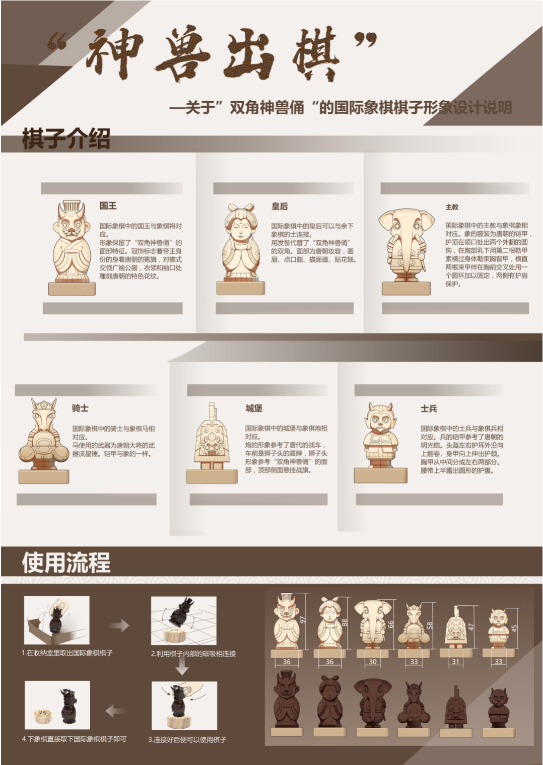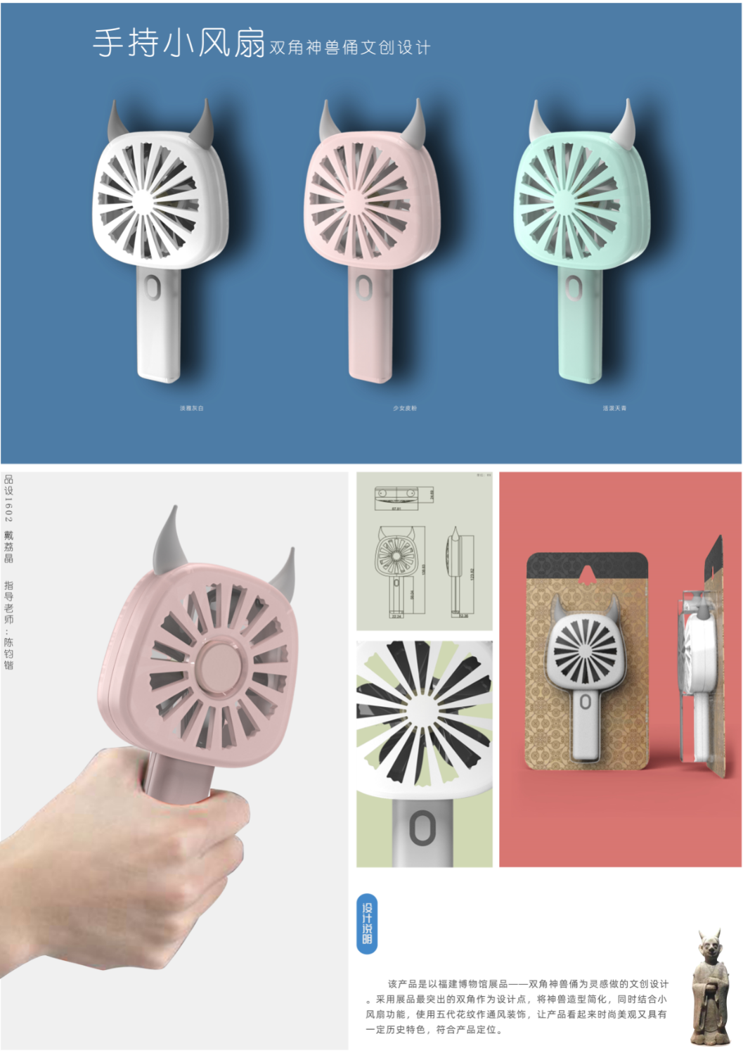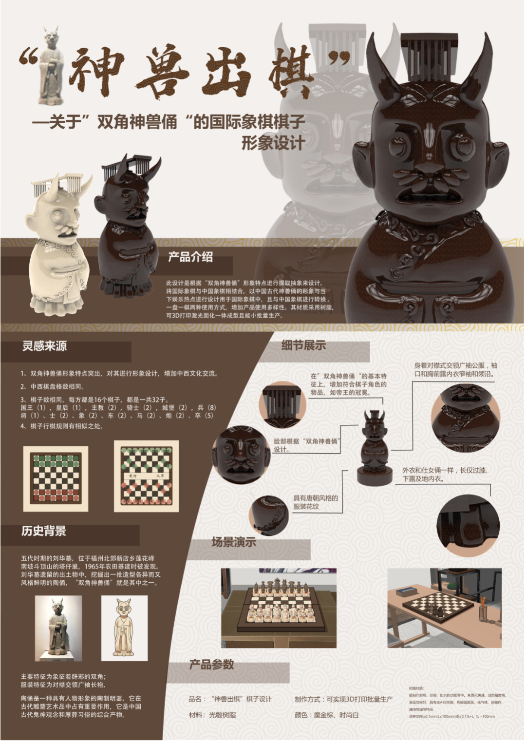 本次课程作品选题为自选课题与指定课题,员工自行选择。指定课题为“2019增材制造全球创新应用大赛”博物馆文创主题,将产品设计专业特点与课程教学内容有机融合,取得了良好的教学效果。伍盛予、赵映雪同学作品“‘神兽出棋’——关于‘双角神兽俑’的棋子形像与包装设计”获三等奖,刘俊同学的作品“‘意像’——双角神兽俑开瓶器与包装设计”和黄天君、罗文浩同学作品“‘与妻书’——文创产品与包装设计”获优秀奖。