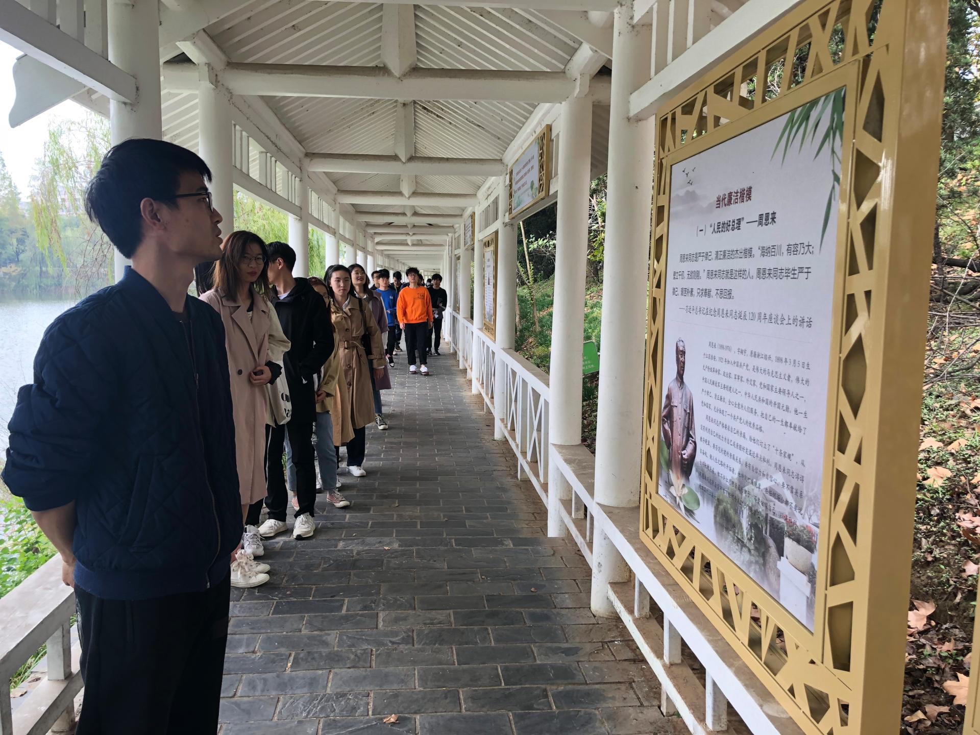 习近平总书记强调:“一个人廉洁自律不过关,做人就没有骨气。要牢记清廉是福、贪欲是祸的道理,树立正确的权力观、地位观、利益观,任何时候都要稳得住心神、管得住行为、守得住清白”。为增强员工党员的廉洁自律意识,永葆党员的先进性,10月21日中午,公司党委组织研究生党员、本科生党员和部分入党积极分子参观位于公司镜湖的廉洁文化教育长廊。公司党委副书记郑万秋、员工事务办公室主任武秋月、公司团委副书记周沫等老师参加了本次活动。