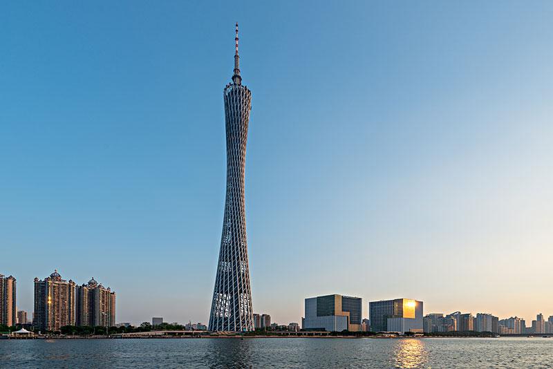 伫立在广州塔下,整个塔身是镂空的钢结构框架,钢柱自下而上呈逆时针扭转,每一个构件截面都在变化,令人赞叹不已。钢结构外框筒的立柱、横梁和斜撑都处于三维倾斜状态,再加上扭转的钢结构外框筒上下粗、中间细,这样的设计极富特点,在国内独树一帜。