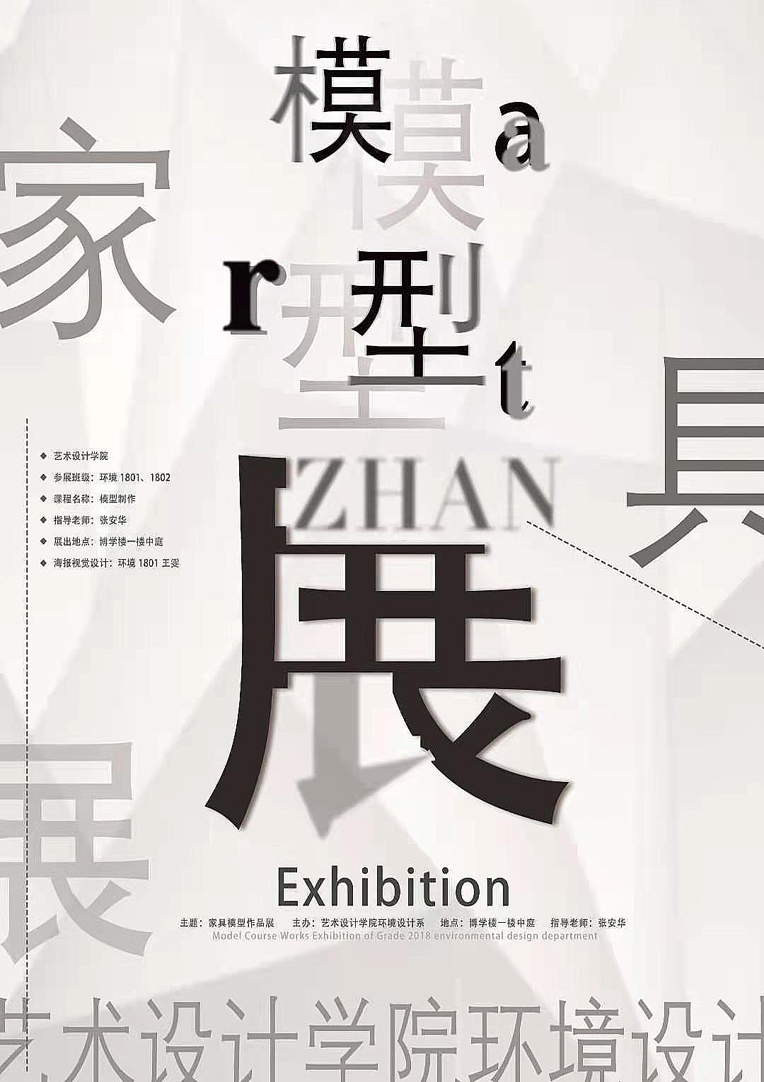 5月24日-6月8日,太阳集团tcy8722在博学楼一楼中庭举办18级环境设计专业同学的家具与模型作品展。参展的班级为环境1801、环境1802两个班,指导教师是环境设计系的张安华老师。
