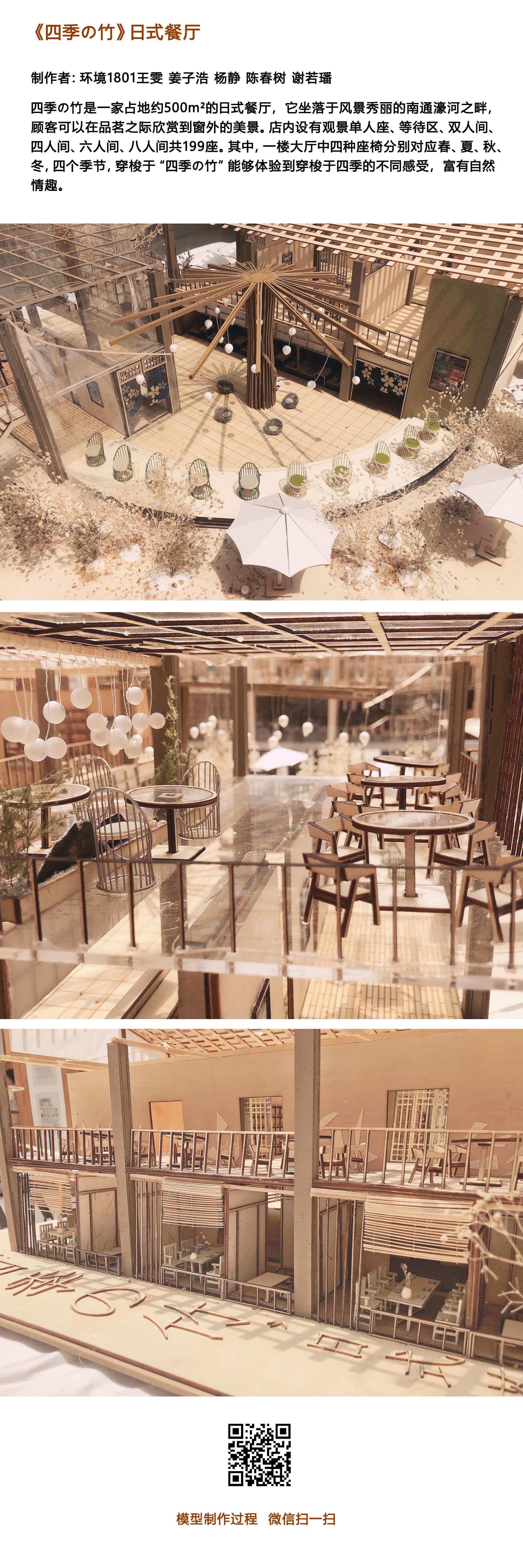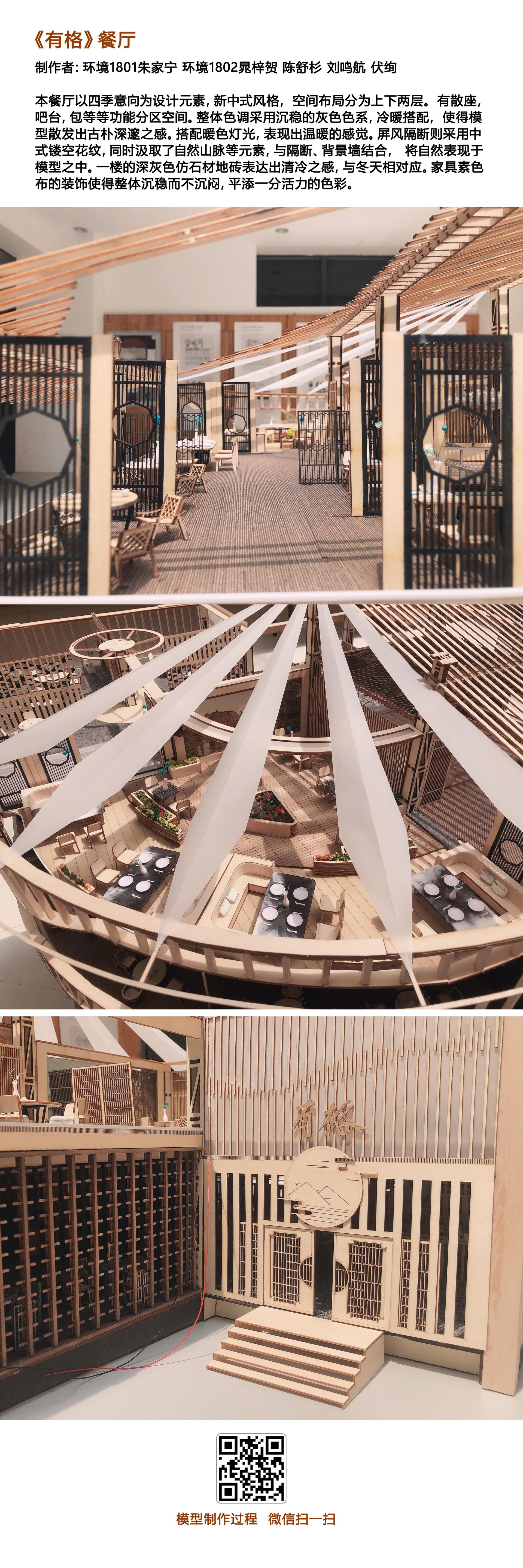 模型制作课程阶段,基于前期每人设计的餐饮空间方案,以3-5人合组完成一个实体模型制作。该课程首先由指导老师对实物模型制作的材料种类、加工工艺、制作工具等知识进行讲解,在此基础上,每组同学对各自组员的前期餐饮空间设计方案、模型最终呈现形式等进行研讨预判,选择最适合制作成实物模型的方案进行后续制作。