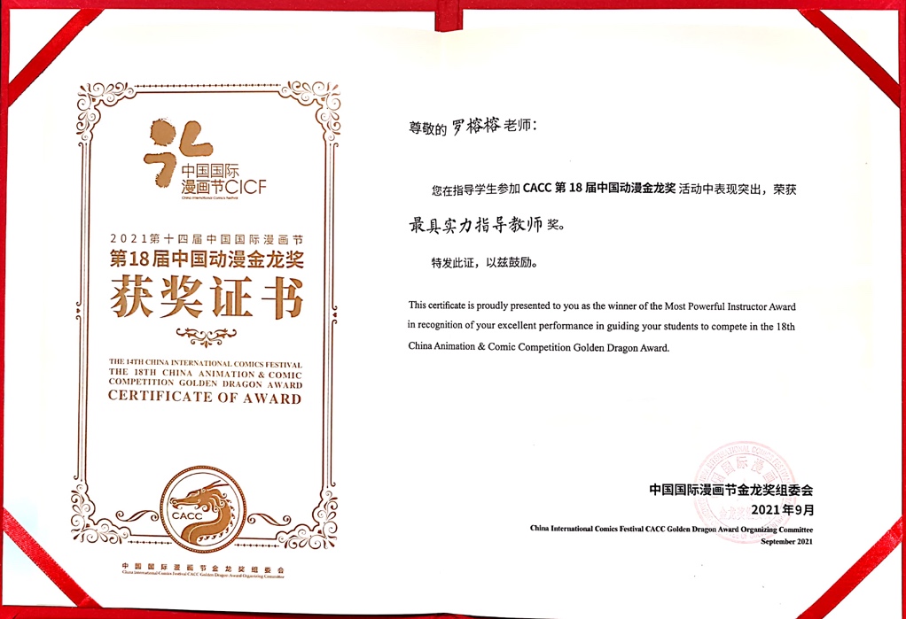 罗榕榕教师荣获“第十八届中国动漫金龙奖最具实力指导教师奖”