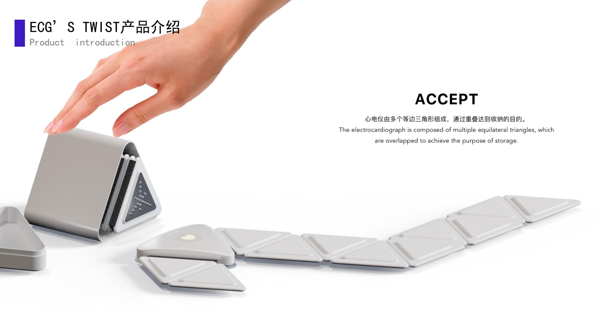 该作品名为ECG TWIST十导智能动态心电仪,产品外观造型采用独特的连续三角造型。设计隐藏了充满机械感的零部件,消除了用户的紧张心理。单一按键功能与手机app的配合非常便于老年用户的操作。