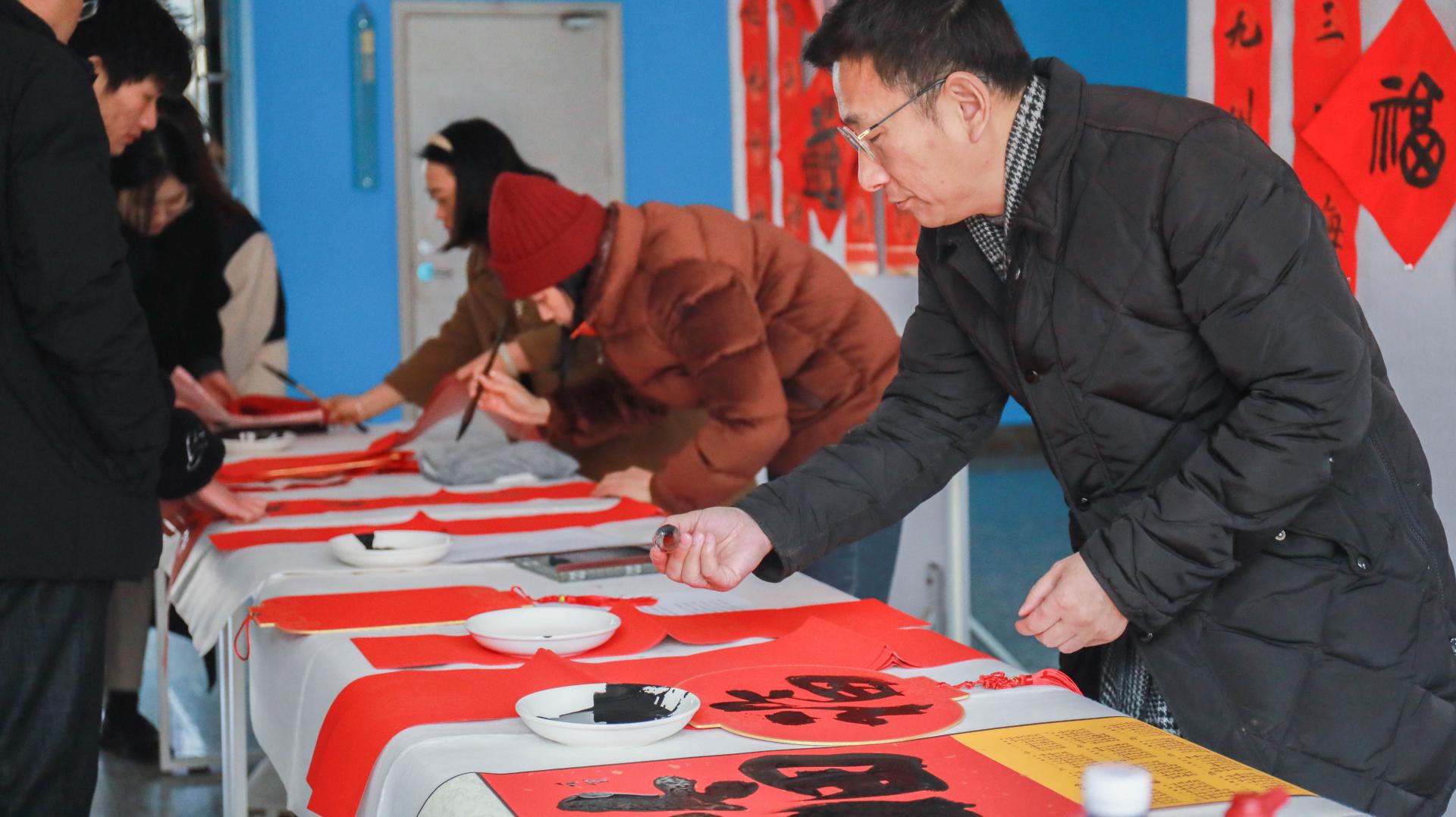 “笔墨浓情传祝福”送春联活动在《春节序曲》中拉开序幕。党委宣传部杨芳,离退休工作处蒋留兆,档案馆钱婷,马克思主义公司陶然,太阳集团tcy8722王志强、付强、冯梓月,交通运输工程公司袁国林,外国语言文学公司江娇等书法名师及书法爱好者现场挥毫,根据在场师生喜好定制专属春联。“天增岁月人增寿,春满乾坤福满门”寄托了师生间真挚的新年祝福;“虎啸风生远,龙腾海浪高”表达了师生对虎年更进一步的殷切期盼。活动现场来往写春联、请春联师生络绎不绝,墨香四溢,喜气洋洋。