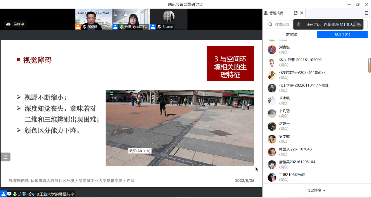连菲老师从各国对认知障碍人群的关爱政策、认知障碍人群的身理特征及其对环境空间的需求、环境设计对策等方面与参会师生分享了自己近年来的研究成果。讲座结束后,连菲老师与在线师生进行了深入的互动交流。最后,张健健副经理代表公司对连菲老师表示衷心感谢,同时也期望更多的同学能加入对弱势群体的包容性设计研究中。