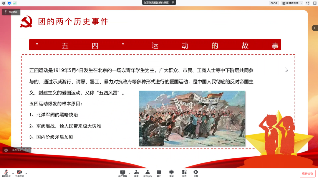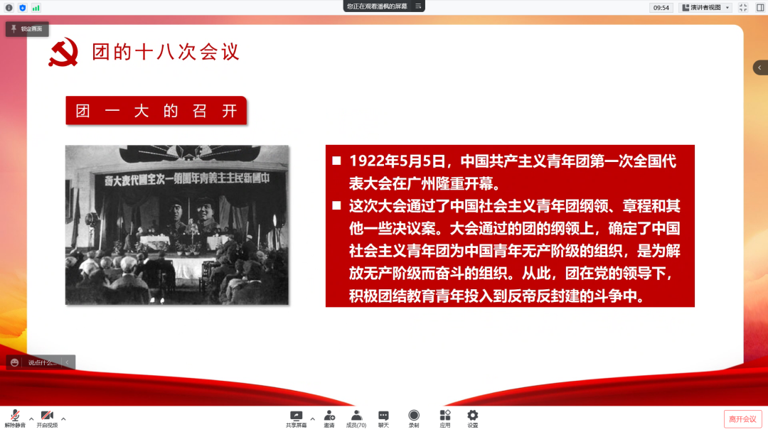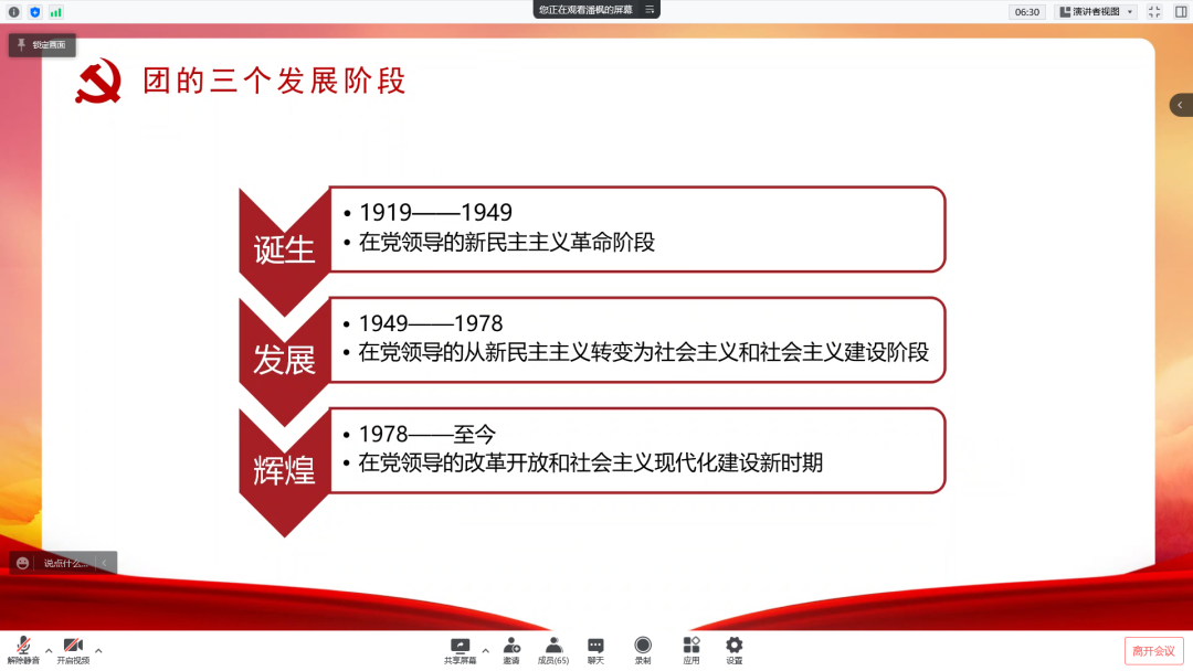 潘枫老师从“团的三个发展阶段”、“团的两个历史事件”、“团的十八次会议”三个方面深入细致地讲述了我们中国共产主义青年团如何在党的领导下一步步攻坚克难、不懈奋斗,把青春奋斗融入党和人民事业,中国青年在革命、建设、改革各个历史时期,为民族独立、人民解放,国家富强、人民幸福作出积极贡献,成为实现中华民族伟大复兴的先锋力量。接着,潘枫老师从“对共青团的新要求”、“汲取建团百年智慧力量 ”两个方面展开,结合同学们身边的榜样团员青年范例,号召同学们要牢记初心、担当使命,自觉践行社会主义核心价值观,勇做走在时代前面的奋进者、开拓者、奉献者,成为社会主义合格的建设者和接班人。
