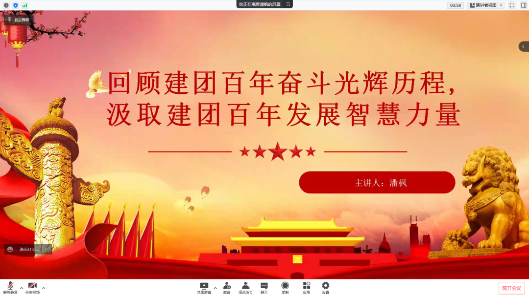 最后,潘枫老师寄语同学们:作为新时代中国共青团的一员,要毫不动摇坚持党的领导,高举习近平新时代中国特色社会主义思想伟大旗帜,始终忠诚于党、坚守政治组织的信仰,牢牢扎根青年、保持群团组织的本色,勇于自我革命、展现青年组织的锐气,做到纪律严明、凸显先进组织的纯洁,不断保持和增强政治性、先进性、群众性,紧跟党走在时代前列、走在青年前列,认真履行引领凝聚青年、组织动员青年、联系服务青年的职责,不断增强对青年的凝聚力、组织力、号召力,团结带领新时代中国青年在实现中华民族伟大复兴中国梦的进程中不断开拓创新、奋发有为。