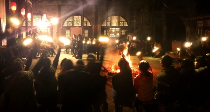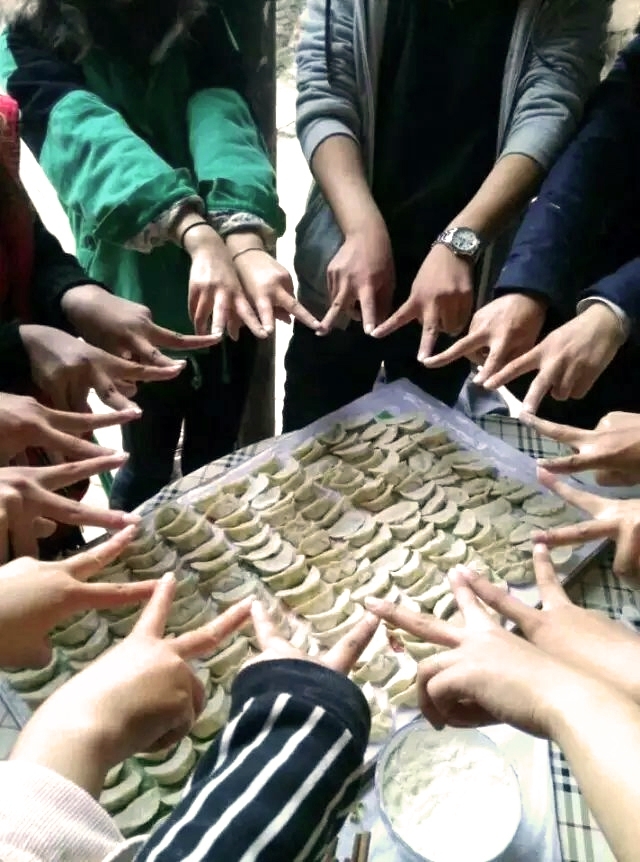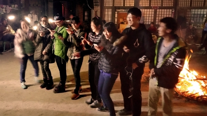 时光荏苒,实习的日子过得飞快。在我们离开的前一天下午,大家聚在一起包饺子,令我们意想不到的是:薛老师竟然还有如此心灵手巧的一面,挨桌示范擀皮包馅,又赢得了一轮同学们的喝彩。吃罢了自己亲自包的饺子,大家都十分开心。此时,老板在院子里准备了一些干柴,所有人围着柴坐成一圈,尹老师主持了篝火晚会的开始,由薛老师举行点火仪式,接着便是同学们的各种即兴表演,熊熊的火光映衬着我们的笑脸,这些天所有的辛苦,都在这熊熊的火光中、快乐的歌舞中一扫而光。