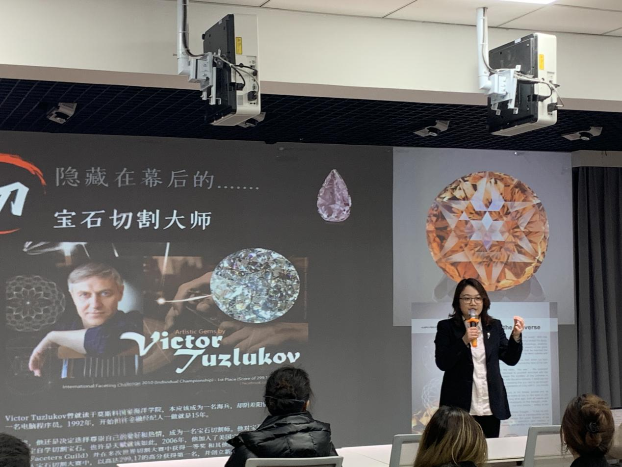 最后,陈昕老师还向同学们展示了珠宝的鉴定标准,包括宝石的颜色、透明度、切割和克拉重量等。她介绍了一些知名的鉴定机构,如GIA(美国宝石公司),并解释了它们在确保珠宝质量和价值方面的重要作用。讲座结束后,陈昕老师与在场的员工进行了深入的互动,回答了他们关于珠宝设计灵感来源和行业职业发展的问题。
