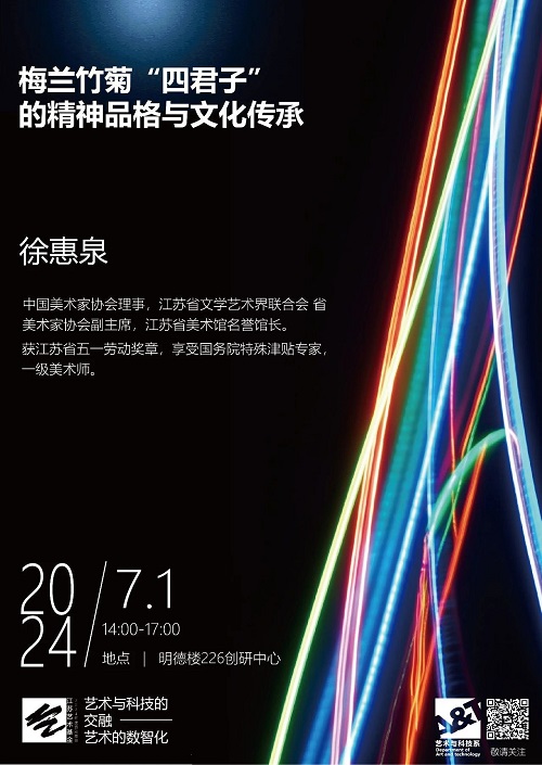 同天下午徐惠泉教授以其深厚的艺术造诣和丰富的文化积淀,生动地阐释了梅、兰、竹、菊"四君子"在中国传统文化中的独特地位和深远影响。他通过对"四君子"象征意义的剖析,带领大家走进了一个充满诗意和哲理的艺术世界。梅花的坚韧、兰花的高洁、竹子的虚心和菊花的隐逸,这四种植物不仅代表了自然的美,更象征着中华民族的精神品格。