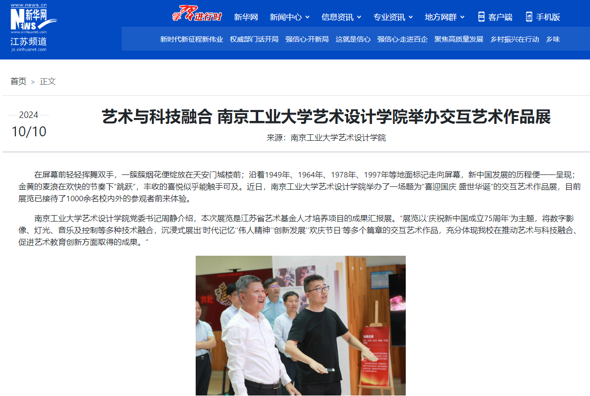 本次展览是江苏省艺术基金人才培养项目的成果汇报展,从概念创意、图纸设计到展品制作,均由基金项目学员与公司艺术与科技专业研究生联合完成。展览以“庆祝新中国成立75周年”为主题,将数字影像、灯光、音乐及控制等多种技术融合,沉浸式展出“时代记忆”“伟人精神”“创新发展”“欢庆节日”等不同篇章的交互艺术作品,充分体现公司在推动艺术与科技融合、促进艺术教育创新方面取得的成果。