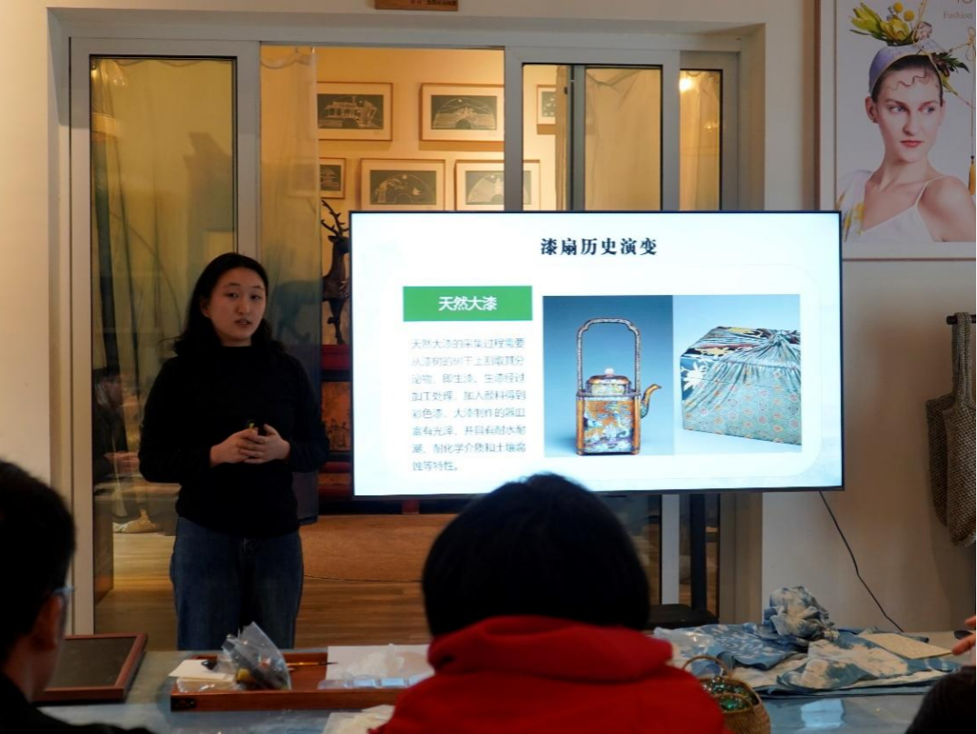 活动伊始,非遗乡创空间的老师向大家讲解了染缬和漆扇的相关知识。其中包括这些非遗工艺品的历史、制作过程、以及在民宿等设计场所的应用。此外,二位老师还展示了染缬和漆扇工艺的优秀作品。听完讲解后,同学们跃跃欲试。体验染缬的同学在染布上印出精致的花纹,体验了印花、扎染、煮制等传统工艺技法。同学们的染布成品各具特色,这不仅仅是一次研学活动的纪念品,更是非遗艺术文化在生活中的具象化体现。